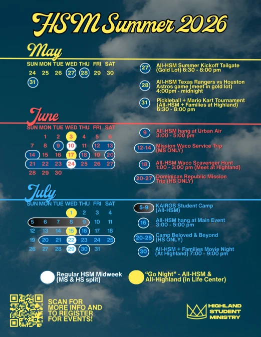 Highland Student Ministry strives to be a place where students in grades 6-12 embrace a Kingdom Culture by following Jesus, experiencing true fellowship, and advancing His Kingdom.
